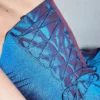 • Fabric: lightweight structured textile with blue-to-red sheen (exact composition to be updated)