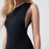Minimalist neckline and clean cut emphasize the body’s natural curves.